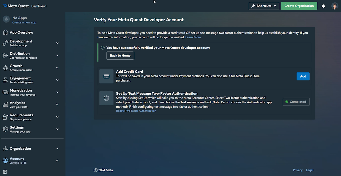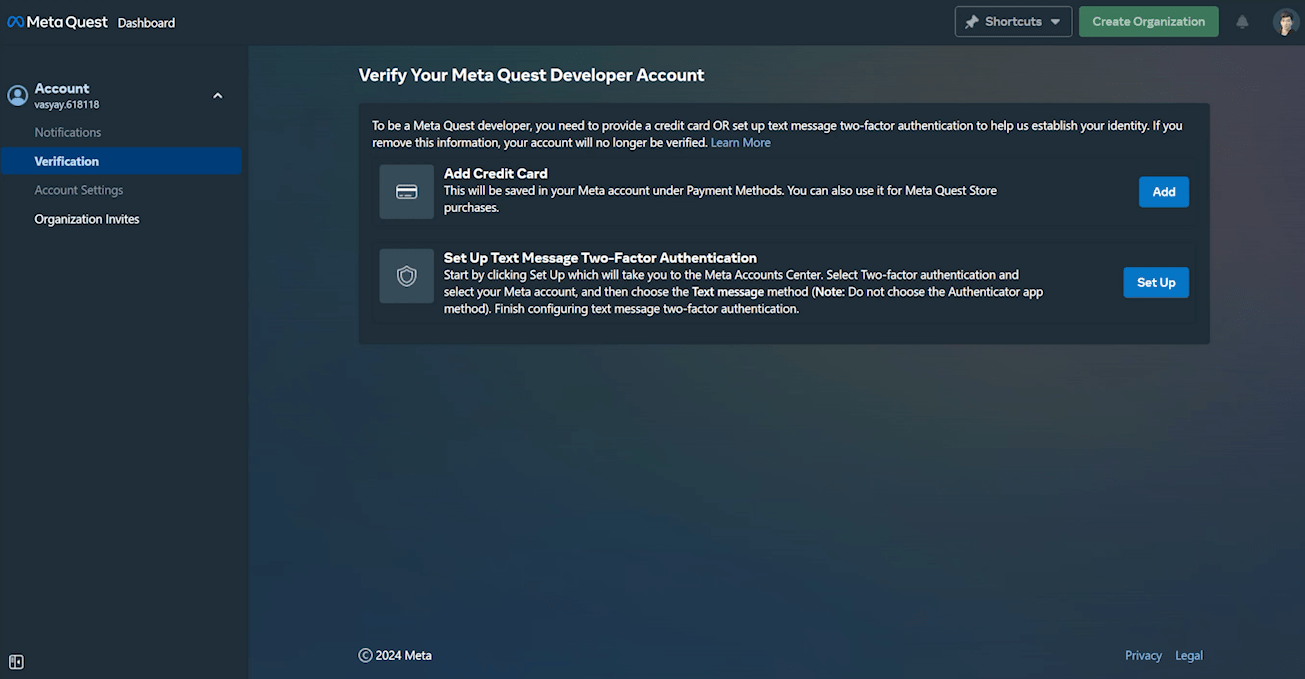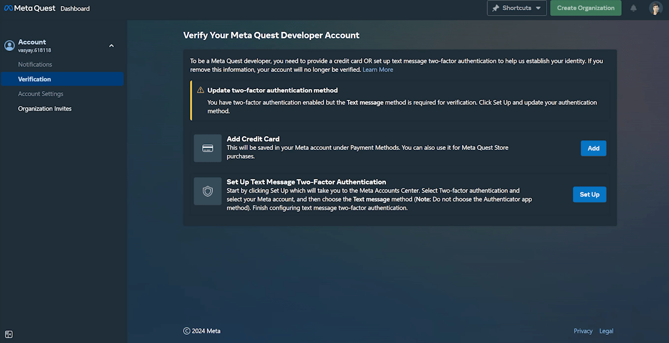 Возвращаемся на страницу https://developer.oculus.com/manage/, и видим, что дела тут немного изменились. Кнопка создания организации всё ещё недоступна, но появилось вполне конкретное уведомление, в котором сказано, что для верификации всё-таки нужно выбрать вариант с текстовым сообщением.