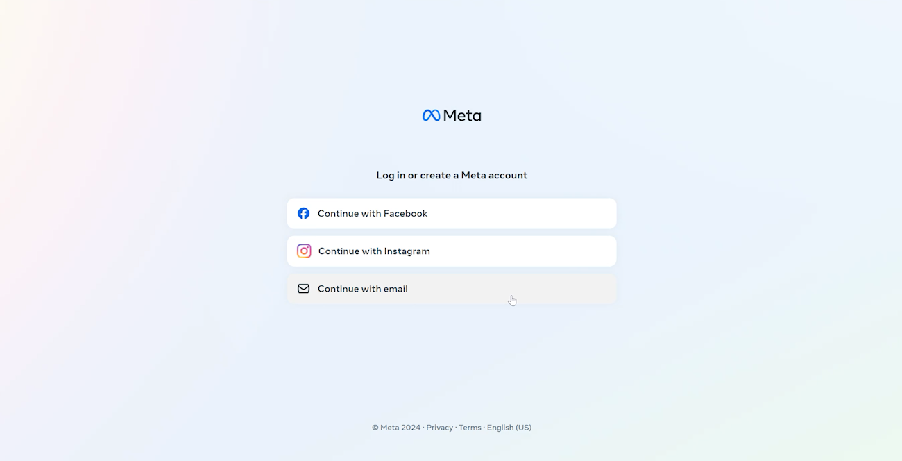 Итак, переходим на сайт Меты, в верхнем правом углу нажимаем на иконку профиля, продавливаем большую синюю кнопку и выбираем вариант создания новой учетной записи с помощью email. Не Facebook и не Instagram, потому что так проще и нужно меньше телодвижений.