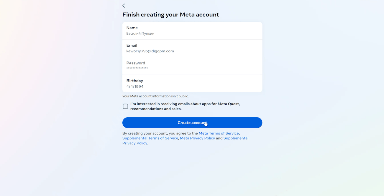 Начнем с создания нового Meta-аккаунта. Зарегистрировать его можно на сайте meta.com. Для чистоты эксперимента я буду использовать одноразовую электронную почту, которая раньше нигде не светилась. Вы же используйте свой реальный почтовый ящик, иначе в аккаунт потом не попадете.