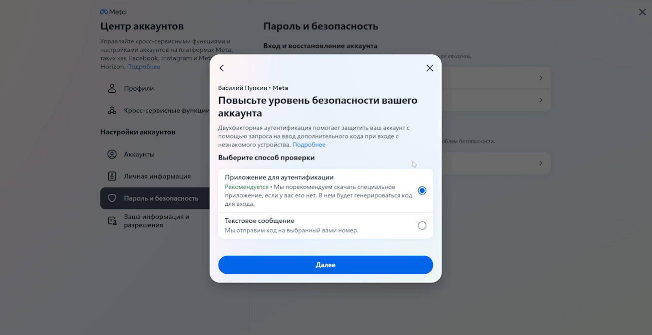 Откроется центр аккаунтов Meta, а точнее вкладка «Пароль и безопасность». Тут нам нужно выбрать пункт «Двухфакторная аутентификация», затем указать аккаунт, для которого мы её настраиваем, и выбрать один из двух способов — приложение для аутентификации или текстовое сообщение. Так как текстовые сообщения приходят через раз, я советую вам выбрать в качестве основного способа именно аутентификацию через приложение. Для этой цели подойдет либо Duo Mobile, либо Google Authenticator. Я лично выберу последний.