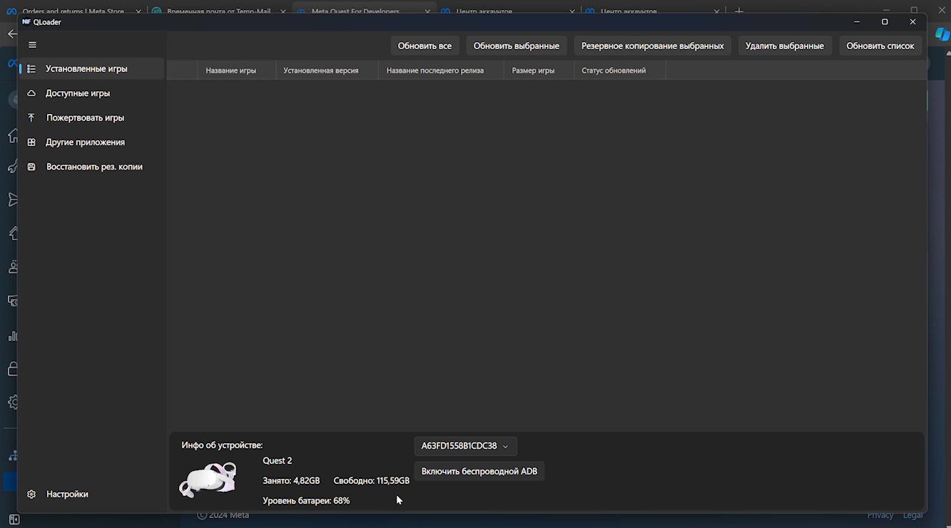 Не отчаиваемся, просто перезагружаем свой Meta Quest и после включения снова подсоединяем его к компьютеру. Надеваем шлем на голову и видим уведомление, предлагающее разрешить отладку по USB. Безусловно, разрешаем. Затем снимаем гарнитуру с головы, не отсоединяя от кабеля, снова запускаем Qloader и на этот раз в нижней панели видим информацию об устройстве. Это значит, что всё сделано верно и теперь вы можете устанавливать на свой шлем сторонние apk-приложения (в том числе самые обычные, которые запускаются на android-смартфонах).