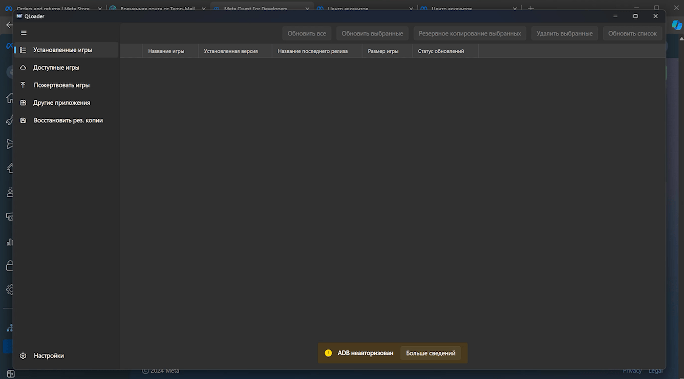 Телефон теперь снова откладываем в сторону и для проверки подключаем шлем к компьютеру. Гарнитура никаких уведомлений нам не выдает, а при запуске Qloader светится надпись «ADB не авторизован».