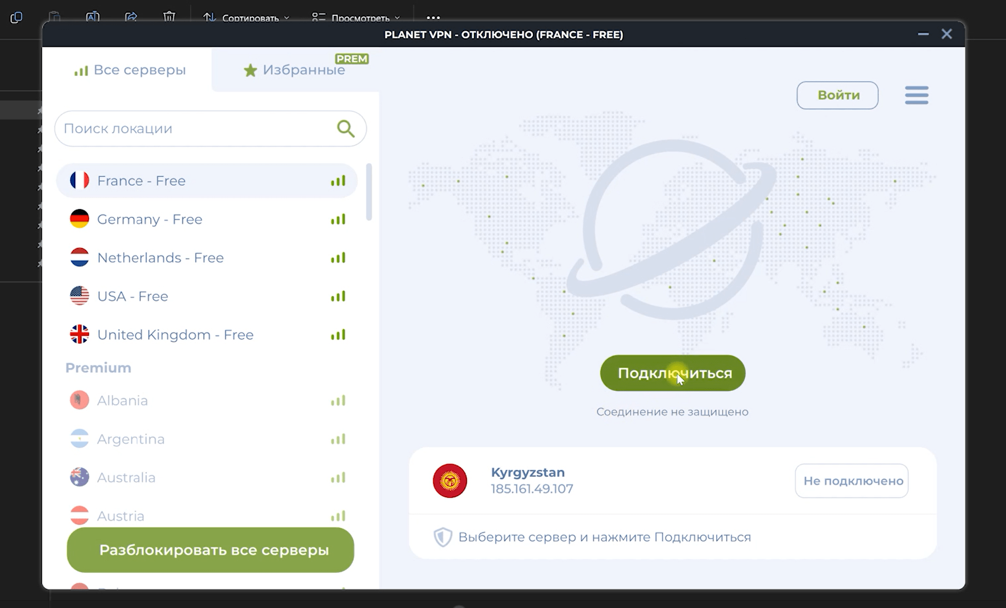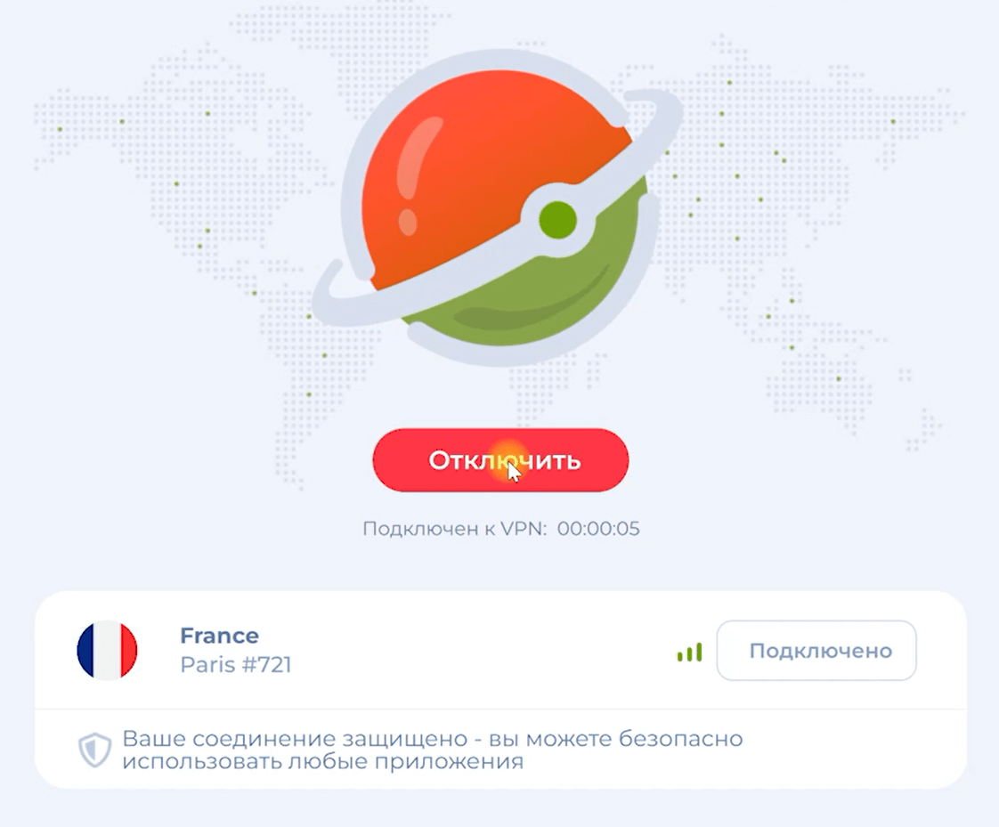 При первом запуске соглашаемся с условиями. Теперь выбираем понравившуюся нам страну для создания VPN-соединения (я, пожалуй, остановлюсь на Германии) и нажимаем на большую кнопку «Подключиться».