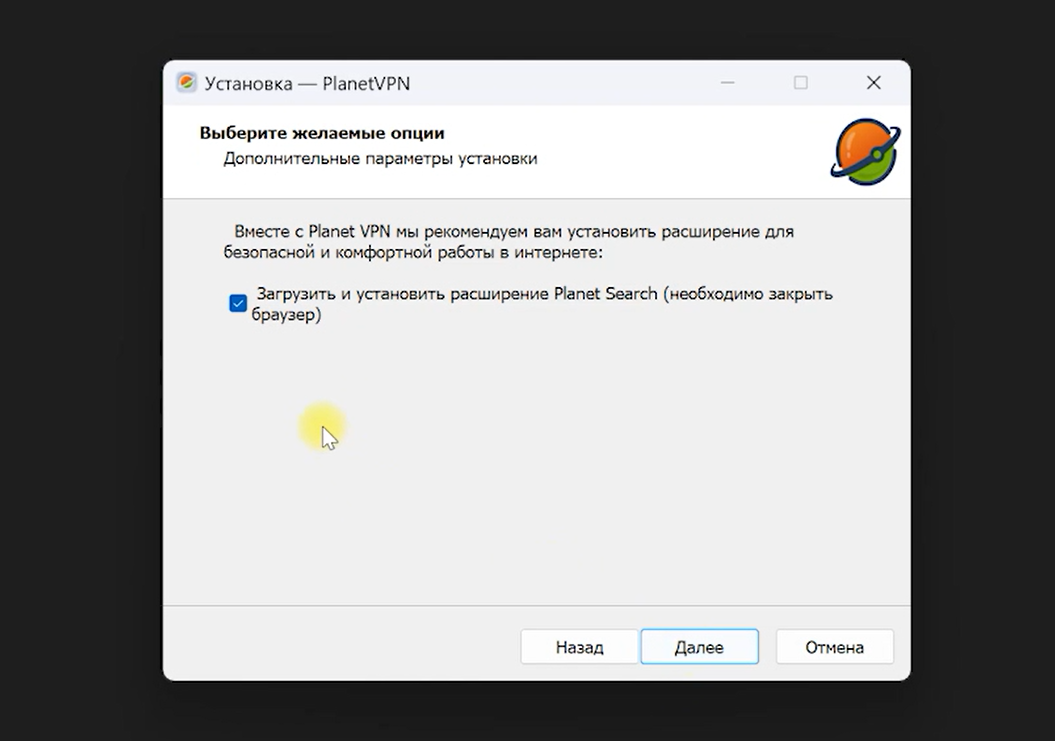 Начинаем с PlanetVPN и запускаем файл инсталляции. Как обычно, в процессе несколько раз нажимаем «Далее», но не забываем на одном из шагов снять галочку, навязывающую нам стороннее расширение для браузера.