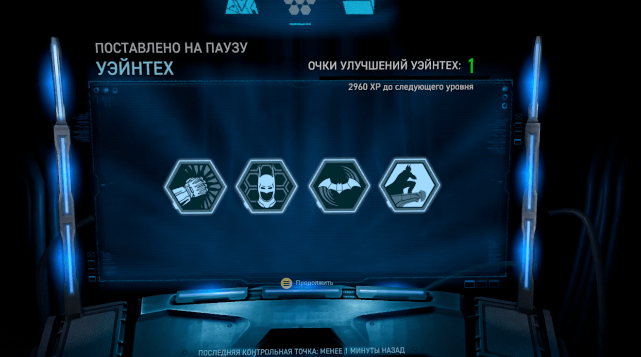 На месте осталась и прокачка персонажа. Называется она также, как и в других играх серии — Уэйн Тэк, а найти её можно в игровом меню. Здесь есть несколько разделов: боевые способности, улучшения костюма, прокачка гаджетов и стелс (который тут называется режимом хищника). Ткнув в любую из способностей, можно почитать о том, что она дает и зачем нужна. В целом тут все довольно просто, понятно и привычно.